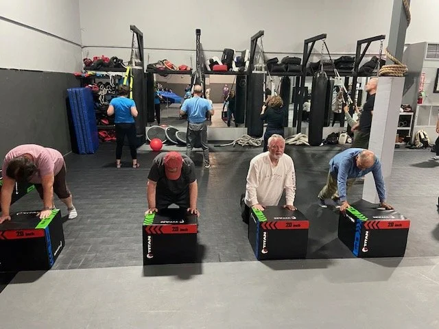 Modified gym class. All exercises have modified options (seated) for safety. Led by Rock Steady trained coach John Bowers.